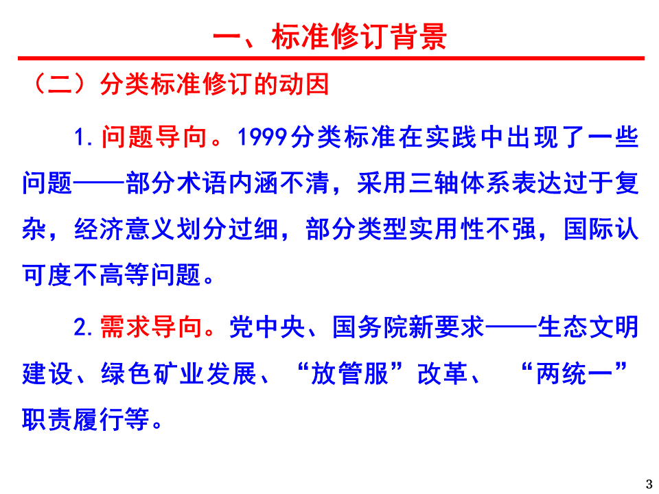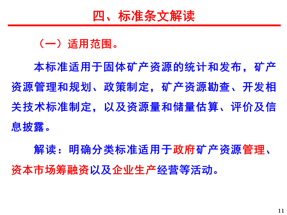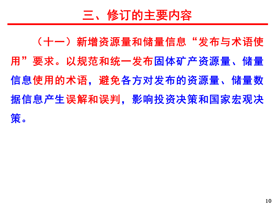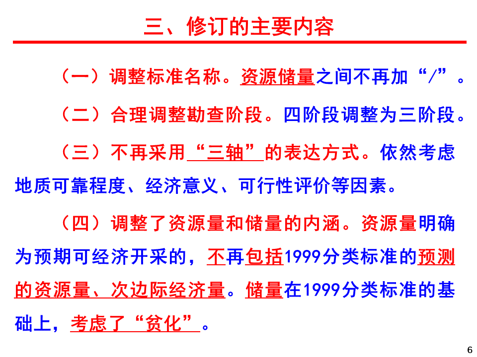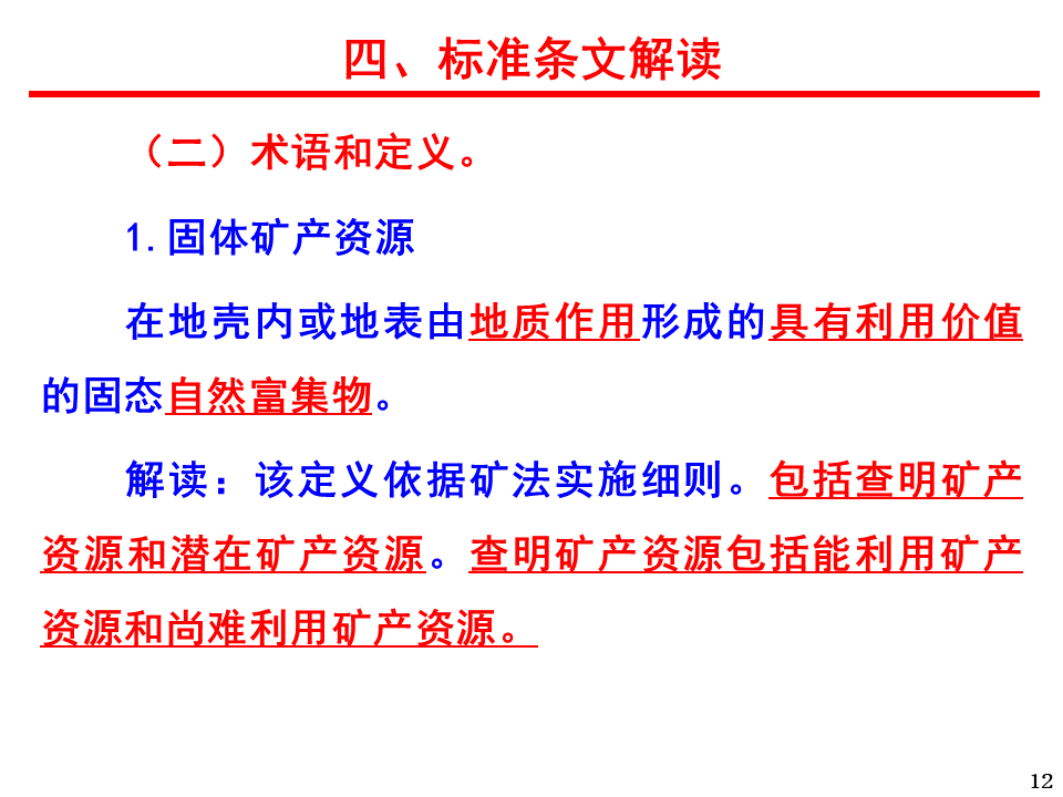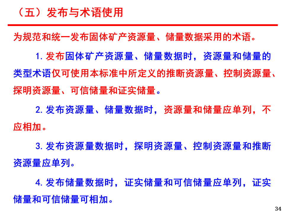 此次新公布的《固體礦產(chǎn)資源儲(chǔ)量分類》主要內(nèi)容包括:范圍;術(shù)語(yǔ)和定義;資源量和儲(chǔ)量類型劃分;資源量與儲(chǔ)量的相互關(guān)系;資源量和儲(chǔ)量的公開(kāi)發(fā)布。新的儲(chǔ)量分類國(guó)家標(biāo)準(zhǔn)是針對(duì)我國(guó)礦產(chǎn)資源管理、市場(chǎng)投融資、企業(yè)生產(chǎn)經(jīng)營(yíng)、國(guó)際合作等需要,為最大化降低社會(huì)認(rèn)知和信息交易成本,對(duì)1999年固體礦產(chǎn)資源儲(chǔ)量分類國(guó)家標(biāo)準(zhǔn)作出重要改革并予以修訂。